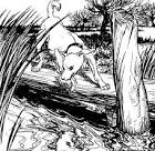 It happened that a Dog had got a piece of meat and was carrying it home in his mouth to eat it in peace. Now on his way home he had to cross a plank lying across a running brook. As he crossed, he looked down and saw his own shadow reflected in the water beneath. Thinking it was another dog with another piece of meat, he made up his mind to have that also. So he made a snap at the shadow in the water, but as he opened his mouth the piece of meat fell out, dropped into the water and was never seen more.